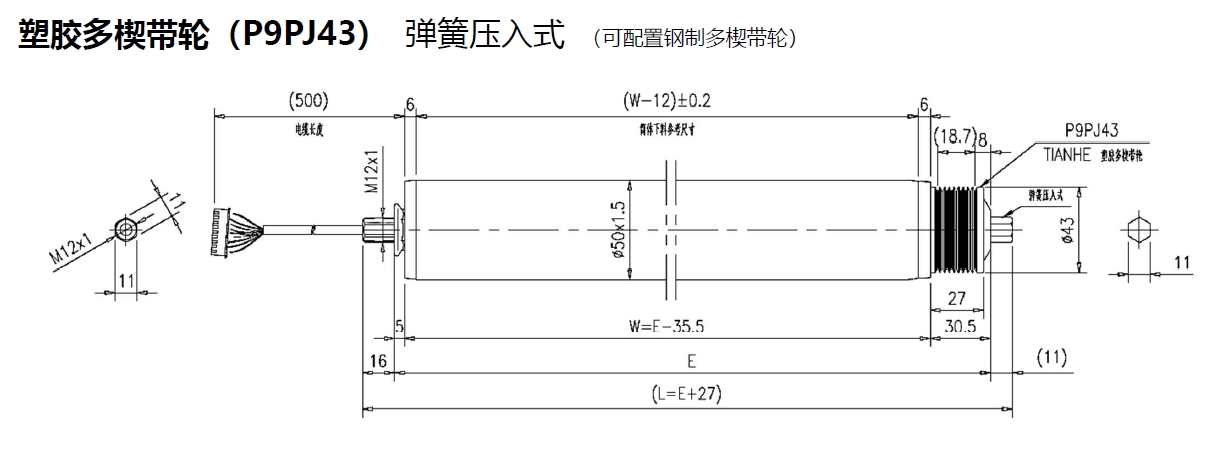 電動(dòng)輥筒 塑膠多楔帶輪(P9PJ43) 彈簧壓入式 (可配置鋼制多楔帶輪)